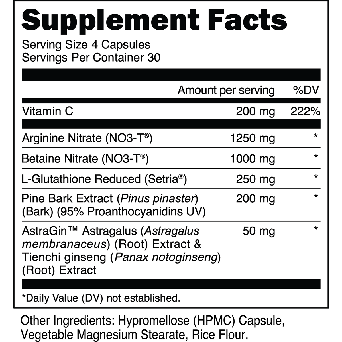 Stimulant-free nitric oxide formula clinically dosed with patented NO3-T®, Setria® glutathione, Pine Bark, and AstraGin™ for unmatched muscle pumps and vascular health.