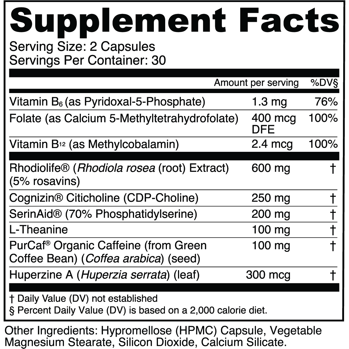 Transparent Labs Cognition is a high-performance, evidence-based nootropic supplement featuring four key ingredients that support healthy cognitive function: Rhodiolife® (Rhodiola rosea extract), Cognizin® (citicoline), SerinAid® (phosphatidylserine), and PurCaf® (organic caffeine).