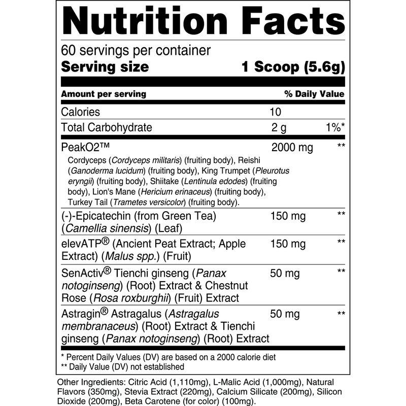 PeakO2™ is a comprehensive blend of six adaptogenic mushrooms, namely Cordyceps, Reishi, King Trumpet, Shiitake, Lion’s Mane, and Turkey Tail. These mushrooms collectively enhance the body's ability to adapt to both physical and mental stressors, including high-intensity and long-duration exercise.