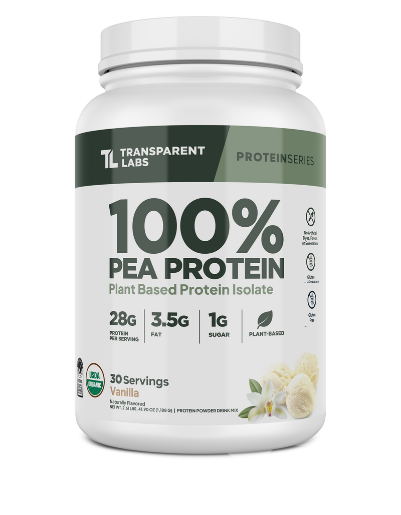 Transparent Labs Pea Protein Isolate is a smooth, easily digested, USDA-certified organic protein made from clean, dairy-free, gluten-free yellow peas. Each serving delivers 28 grams of plant-based protein, abundant in all nine essential amino acids and BCAAs to support muscle growth and recovery. Although Pea protein isolate is not as ‘complete’ as forms of animal-based protein, it has a relatively balanced amino acid profile, especially high in lysine, which is often low in other plant proteins like rice.