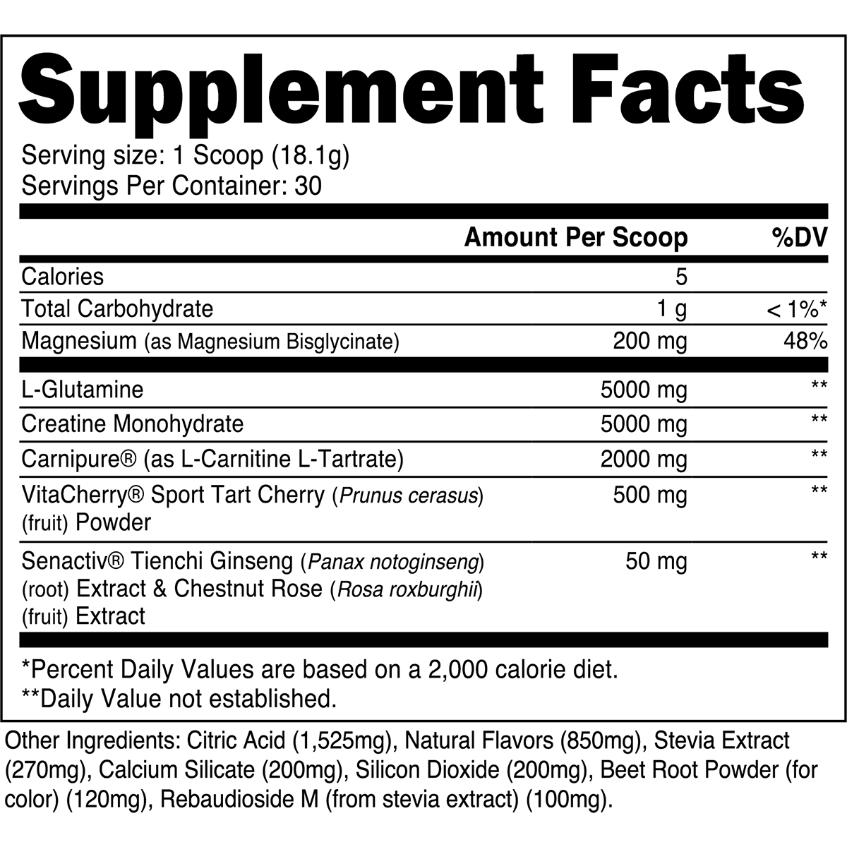 Optimize post-workout recovery with clinical doses of BetaPure™, Carnipure®, BetaPrime™, Vitacherry®, Beta-Alanine, and L-Glutamine.